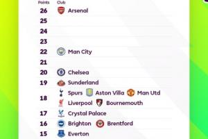 体育资讯11月12日讯 英超官方晒图英超的“积分榜”,这份榜单以积分为序号,不以排名列出。